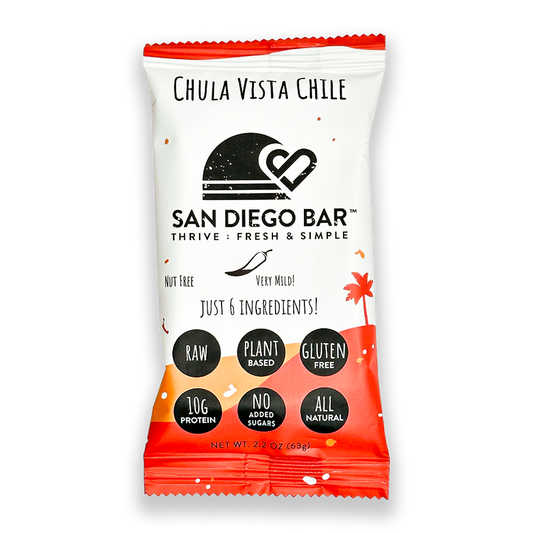 Spice up your routine with this all-natural, nut-free, and gluten-free snack crafted for those with an active lifestyle. Our Chula Vista Chile bar combines the mild heat of chile pepper with the natural sweetness of dried fruits, while rich cacao nibs add depth of flavor. With no added sugars and only six ingredients, this bar provides long-lasting energy for any activity. It’s a delicious, healthy option that keeps you fueled and ready for whatever the day brings.